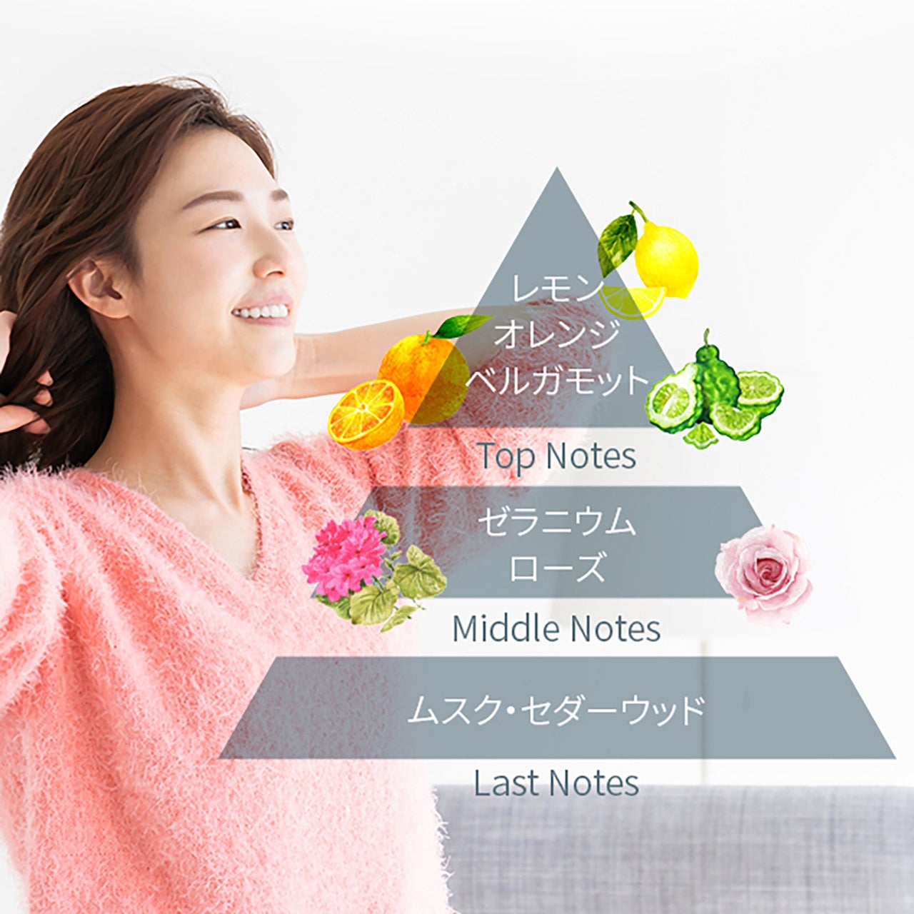 爽やかさと華やかさを併せ持つゼラニウムに上品なローズを加え、瑞々しいベルガモットを中心とした柑橘をアクセントに加えたナチュラルなグリーンハーブの香りで、毎日のヘアケアが癒しの時間に変わります。