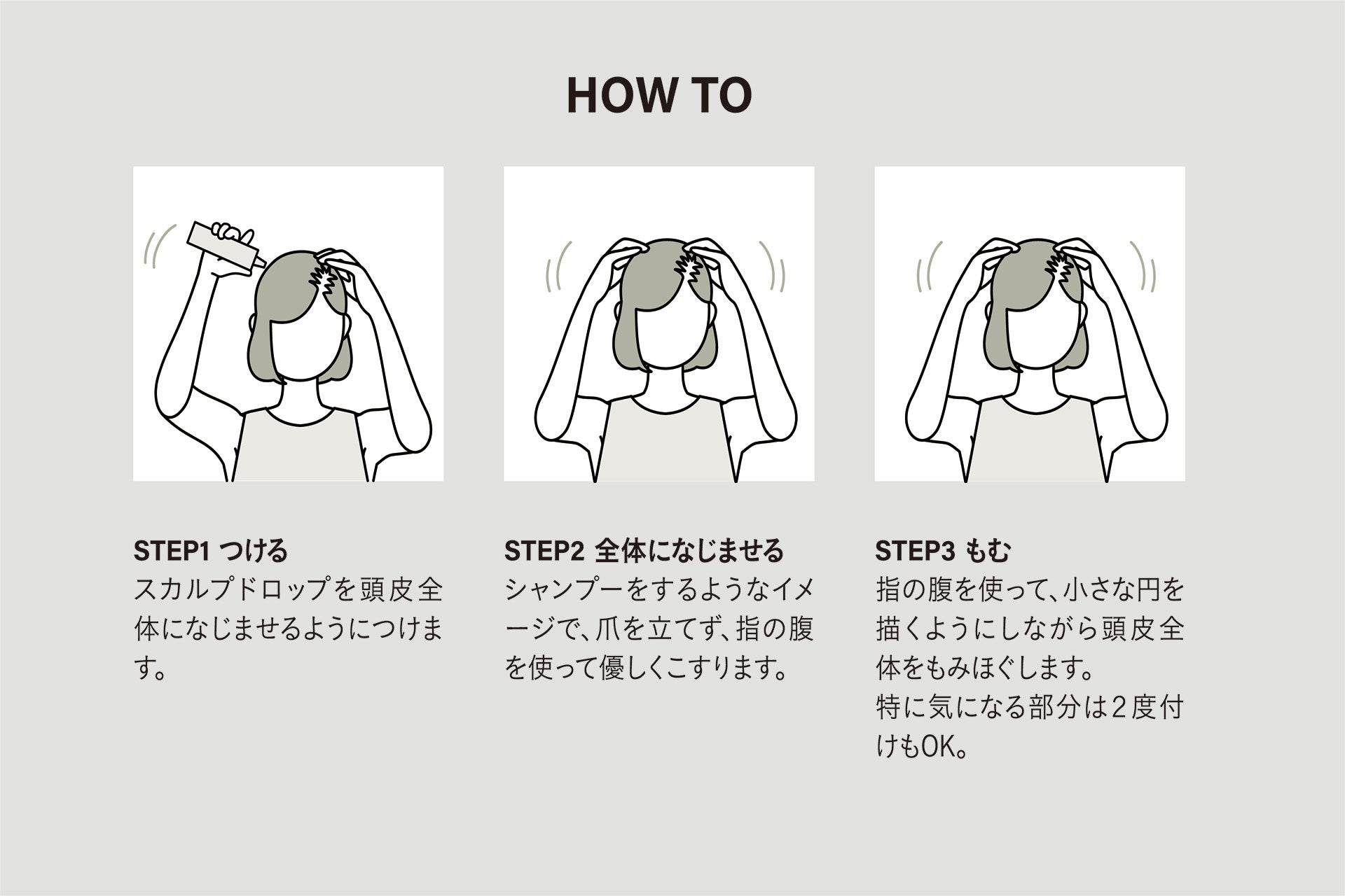 毎日 1 ~ 2 回、頭皮全体に適量を塗布します。 シャンプー後は、タオルドライし水気をよく拭き取ってからお使いください。