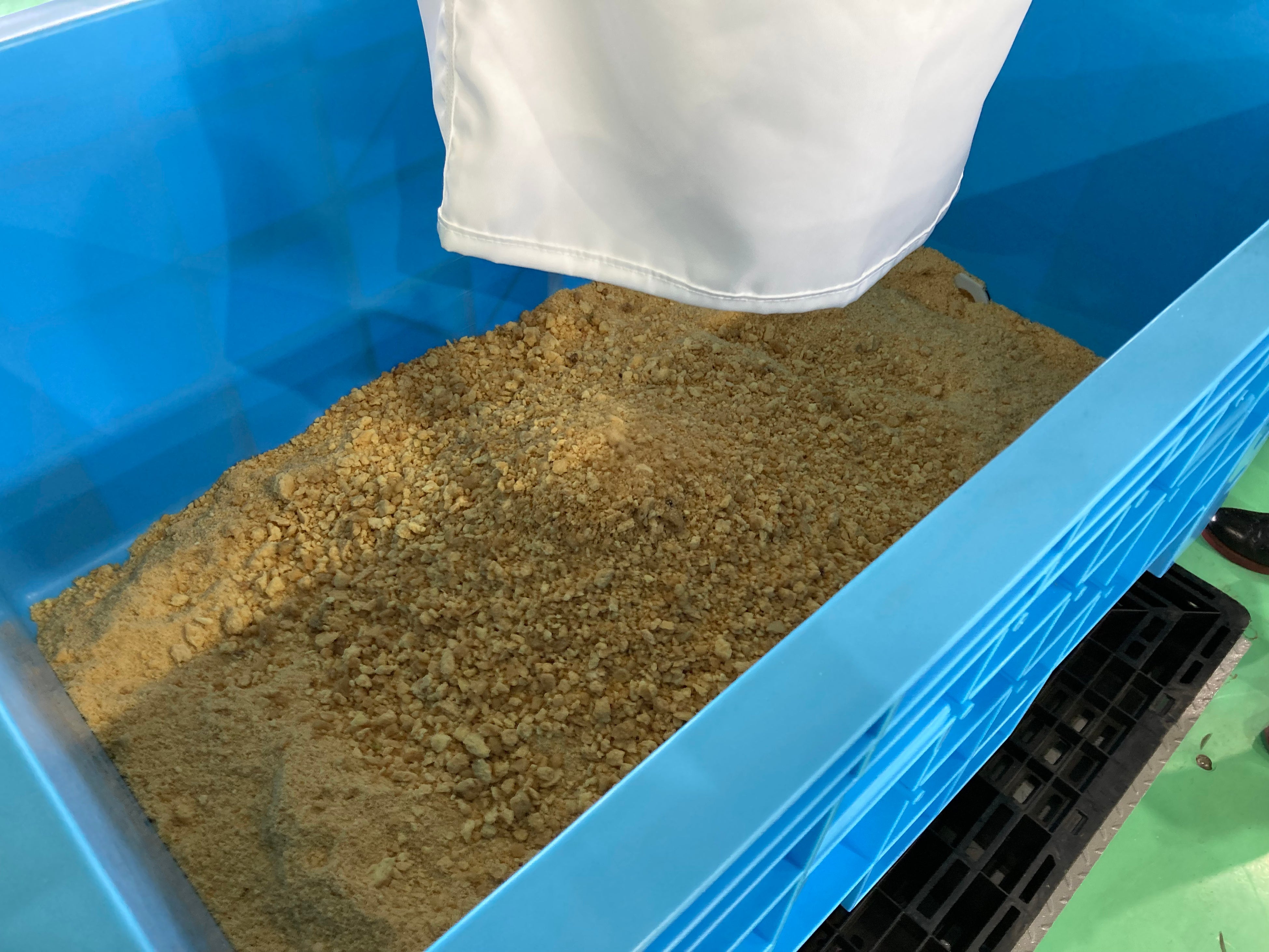 食品製造業者に設置された揚げカス搾り機で処理した油は再利用、揚げカスは、エコリオが買い取ります。