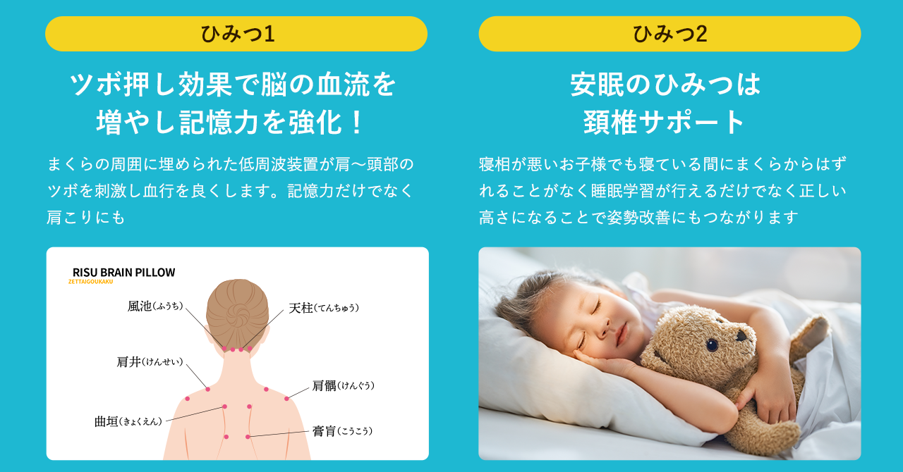 ひみつ1:枕に埋められた低周波装置により、肩~頭のツボを刺激します。脳の血流が良くなり記憶力を強化するのはもちろん、肩こりにも効果が!