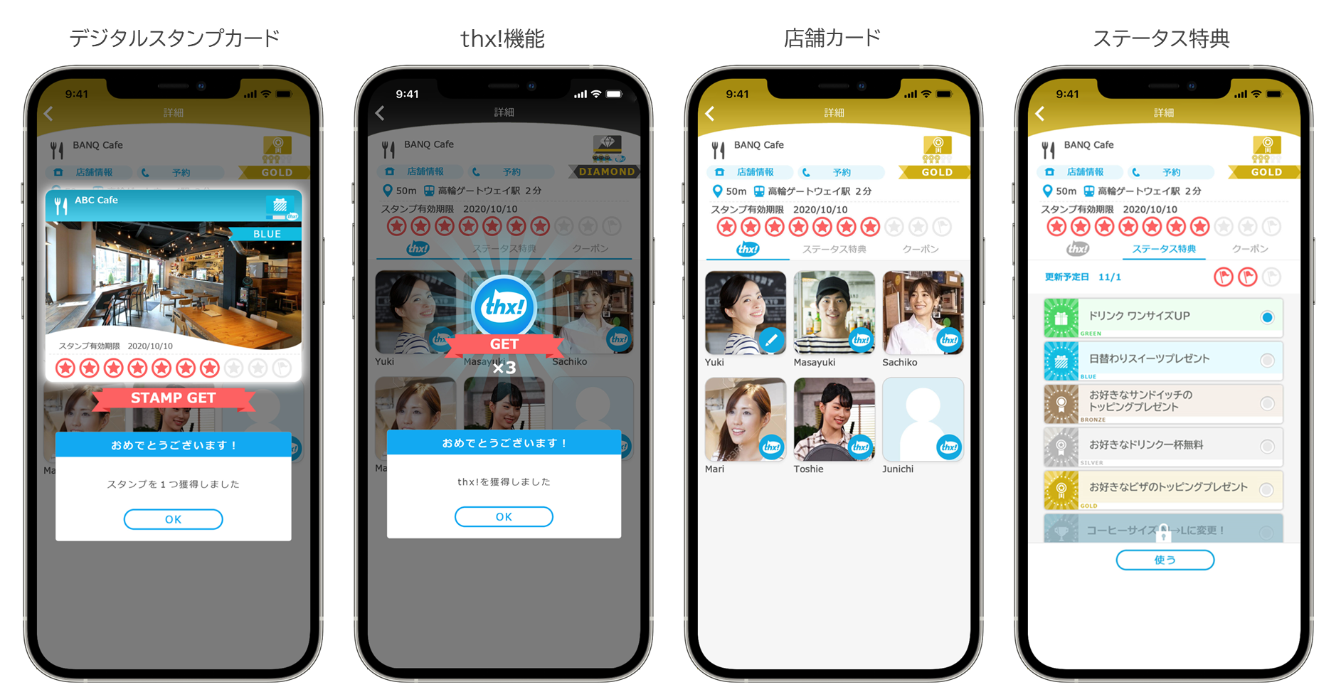 クロスポは、店舗向けにデジタルスタンプカード機能に加え、これまで開発してきた「thx!」機能をお客様と従業員とのコミュニケーションとして活用、さらに、常連客にステータスを付与できる機能を全て無料で提供します。店舗はコスト負担なく以下の機能を利用することができます。