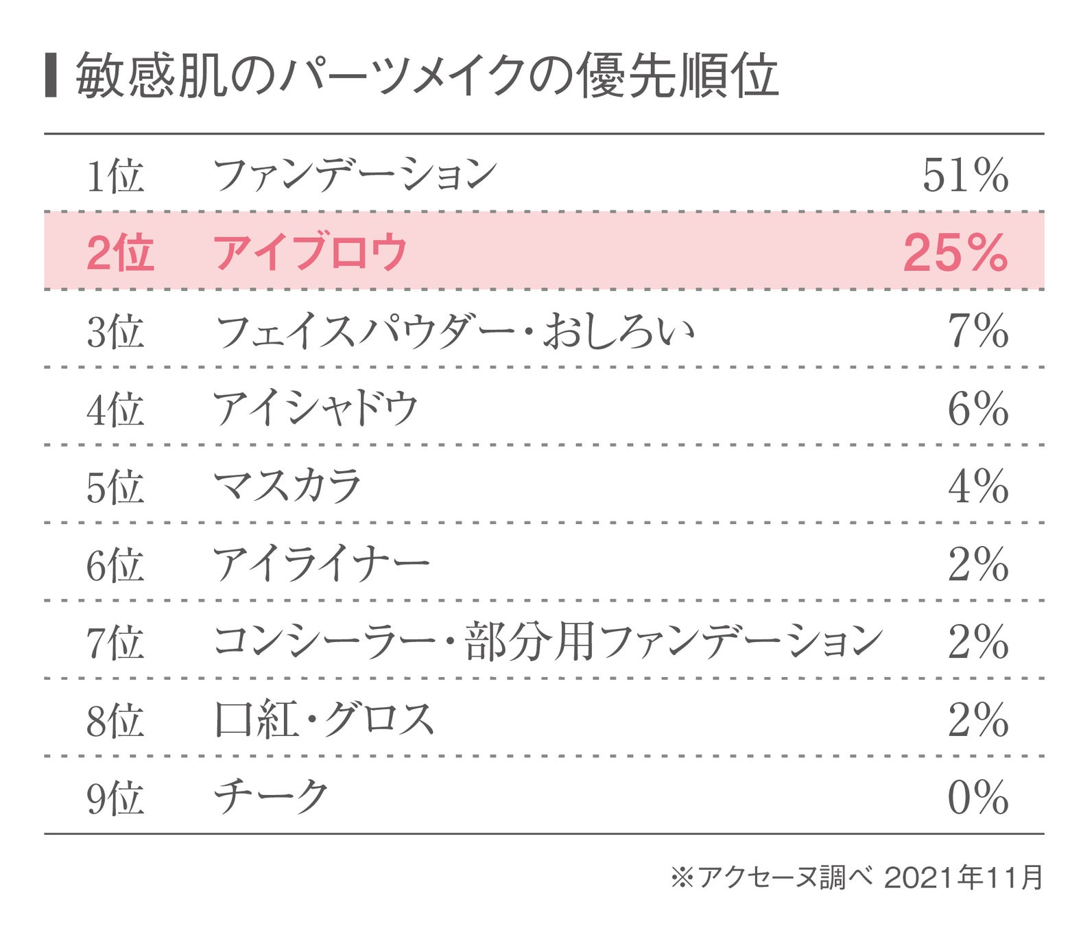 「眉毛が薄い、欠けている」といった眉にメイクをする敏感肌の方からは、「色がのりにくい」「消えやすい」「自然に見えない」など、仕上がりへのさまざまな不満があがりました。さらに、眉は、メイクによる摩擦が最も大きい部分であるため、「描くときに痛い」「眉にかゆみがでる」「眉部分の肌が荒れる」といった肌トラブルへの不安も。
