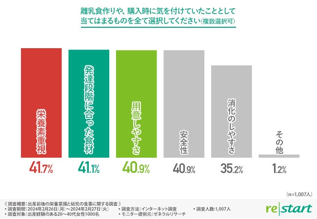 「離乳食作りや、購入時に気を付けていたこととして当てはまるものを全て選択してください(複数選択可)」と質問したところ、『栄養素重視(41.7%)』と回答した方が最も多く、次いで『発達段階に合った食材(41.1%)』『用意しやすさ(40.9%)』と続きました。