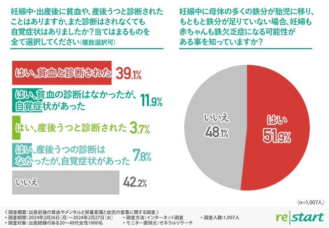 そこで今回、リ・スタート株式会社(http://www.re-start.co.jp/)は、出産経験のある20~40代の女性を対象に「出産前後の貧血やメンタルと栄養意識と幼児の食事」に関する調査を実施しました。