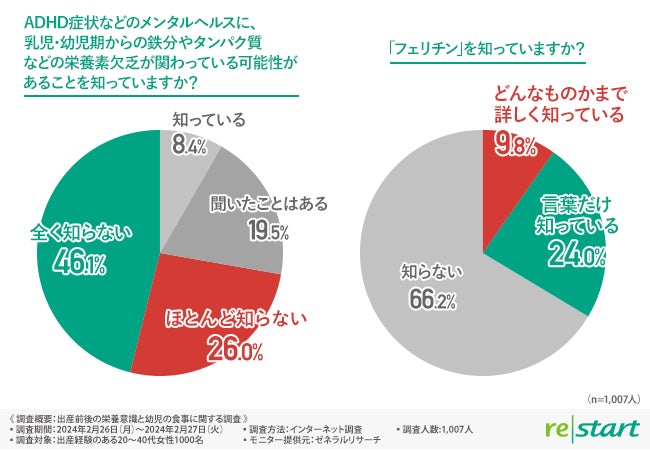 フェリチン検査サービスや分子栄養医学ヘルスケアサービスを提供するリ・スタート株式会社(所在地:東京都港区、代表取締役:谷内 久哉)は、出産経験のある20~40代女性を対象に「出産前後の貧血やメンタルと栄養意識と幼児の食事」に関する調査を実施しました。