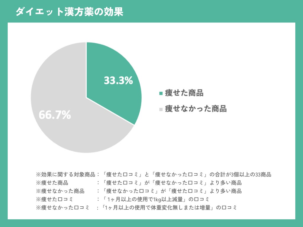 ・痩せたと報告されたダイエット漢方薬は、全体の3分の1(33商品中11商品)だった