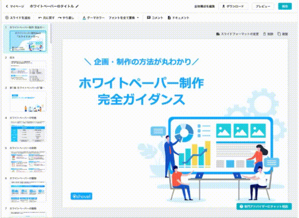 ホワイトペーパー制作に特化したデザインテンプレートが数多く用意され、デザイナーの手を借りることなく、誰でも高品質の資料制作が実現できます。