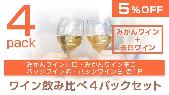 三ケ日みかんワインの甘口、辛口2種類のスパウトパックワインを限定発売。さらに同タイプの赤ワイン、白ワインとの飲み比べセットも特別価格にて販売。