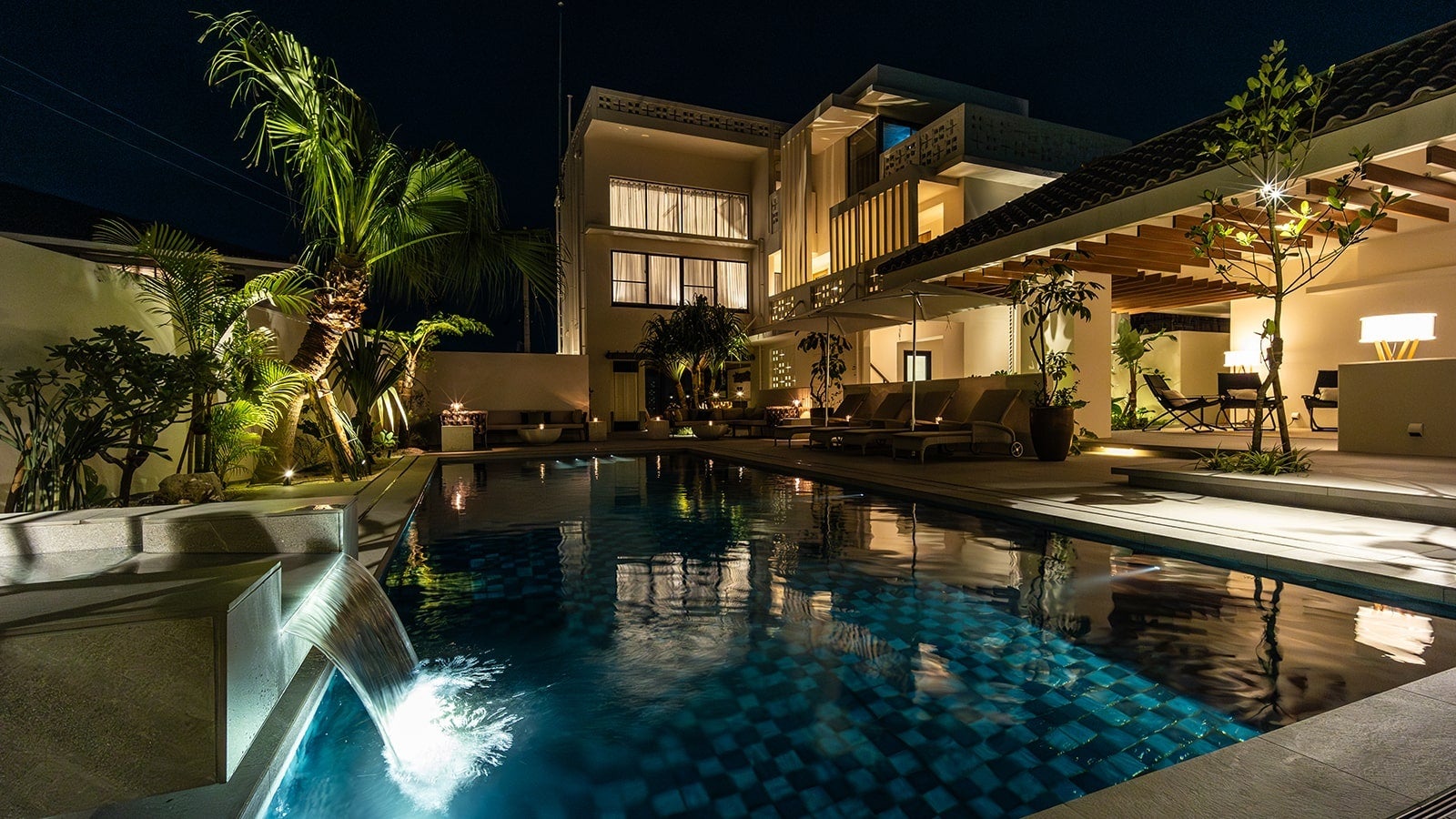 夜はライトアップされナイトプールに変わります。日焼けを気にすることなく、星空を眺めたりしながらゆったりとプールをお愉しみいただけます。