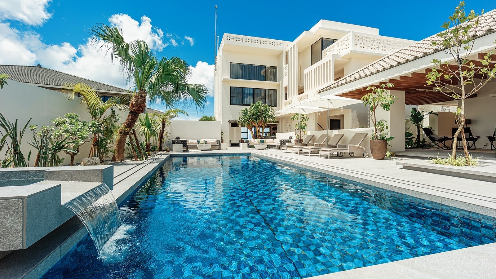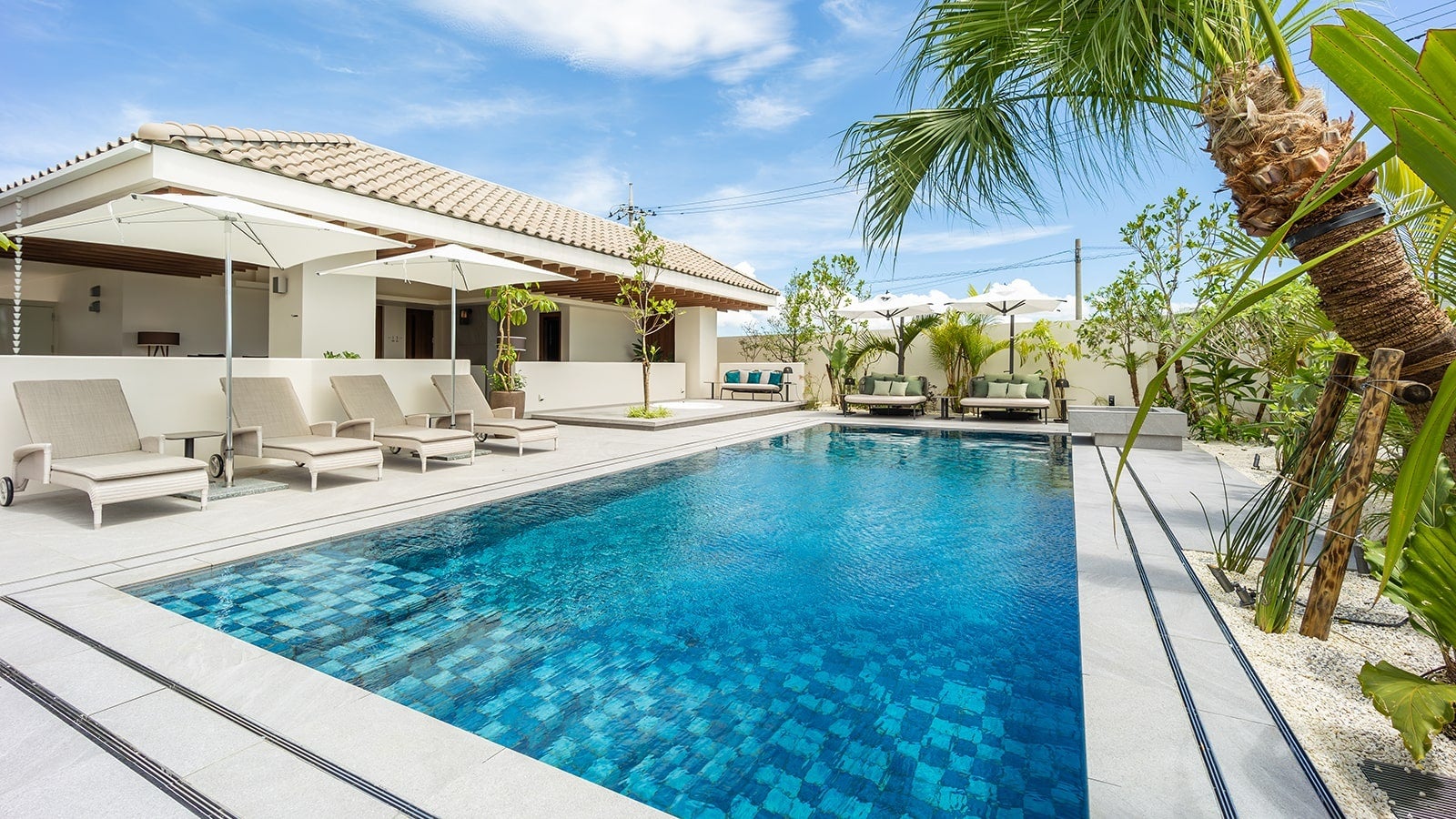 広さ10m×4mの温水プールは熱帯植物に囲まれ、プールの周りには屋外ジャクジーと、ゆったりと寛げるデイベッドやソファを配置しております。10月〜3月は温水管理を行うため季節を問わずお愉しみいただけます。