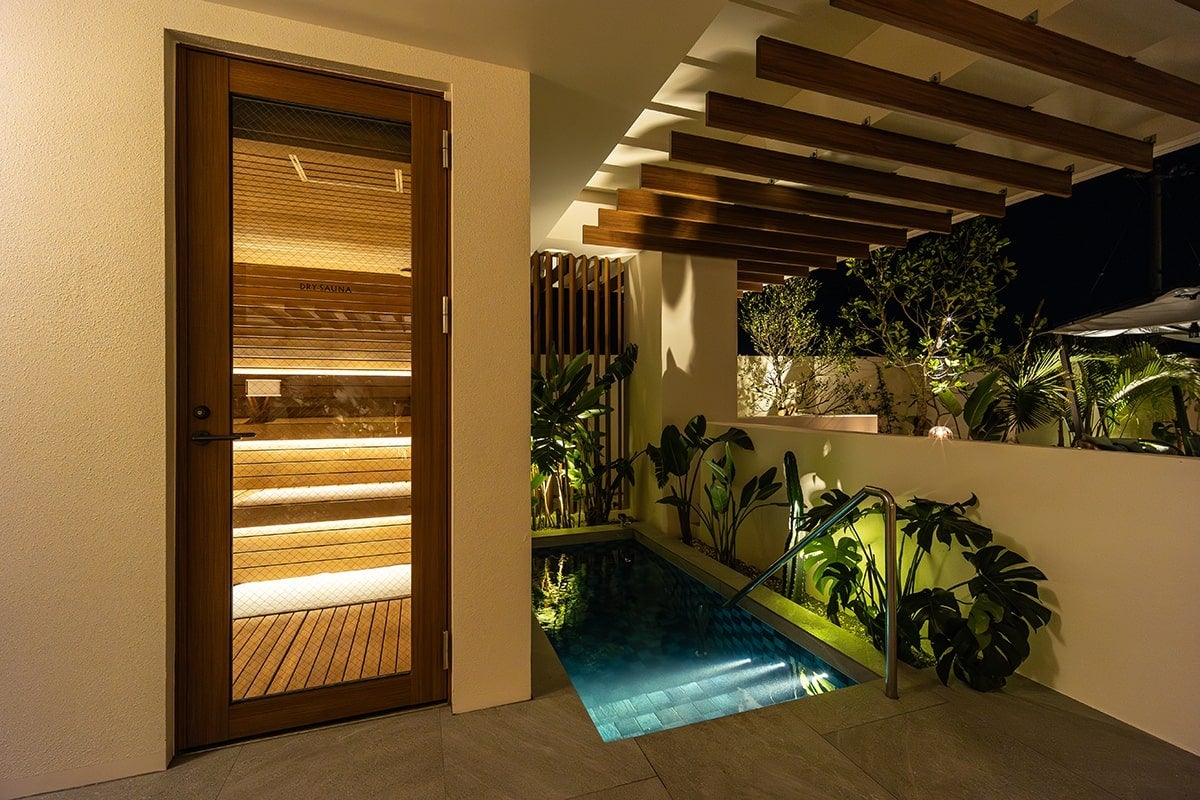 夏場でも17度以下を保つよう冷水管理された水風呂、最適な湯温の屋外ジャクジー、整いスペース、屋外プールを周遊できる造りになっています。