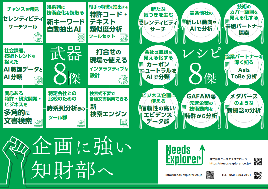 ニーズエクスプローラ社は、2022年11⽉9⽇~11日の「2022特許情報フェア」に出展いたします。知財部門のビジネス貢献スキルアップに向けた新たな武器8傑、レシピ8傑をご紹介しています。