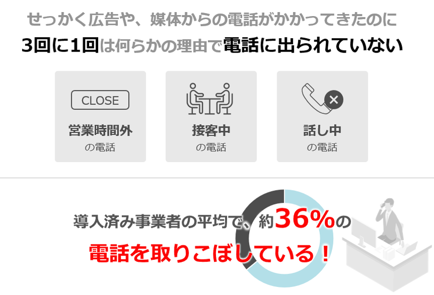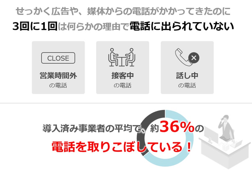 弊社の調査によると、全体の約36%(約3回に1回)の電話を取りこぼしてしまっている現状がございます。(当社調べ:2022/1)