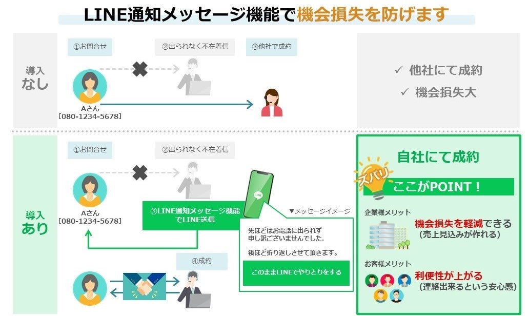 この機能により、電話に出られなかったお客様宛にLINEにてメッセージをお送りする事が可能になります。