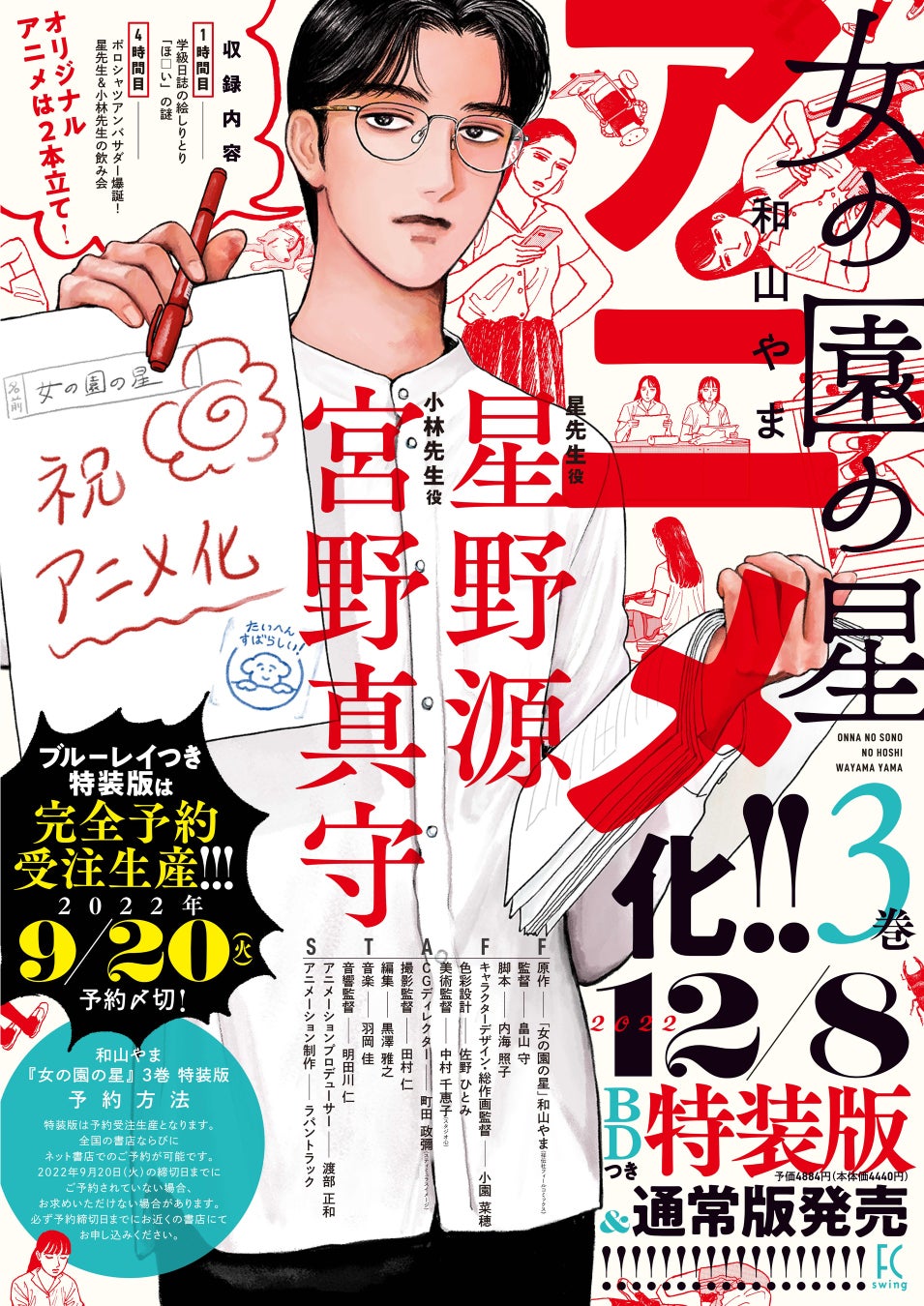 2022年12月8日に発売となる和山やま著『女の園の星』3巻(女性コミック誌「FEEL YOUNG」で好評連載中)。特装版には、星野源さん、宮野真守さんが声優を務めるオリジナルアニメBlu-ray Discが収録される。完全受注生産のため絶賛予約受付中のいま、新たな特典が緊急決定。