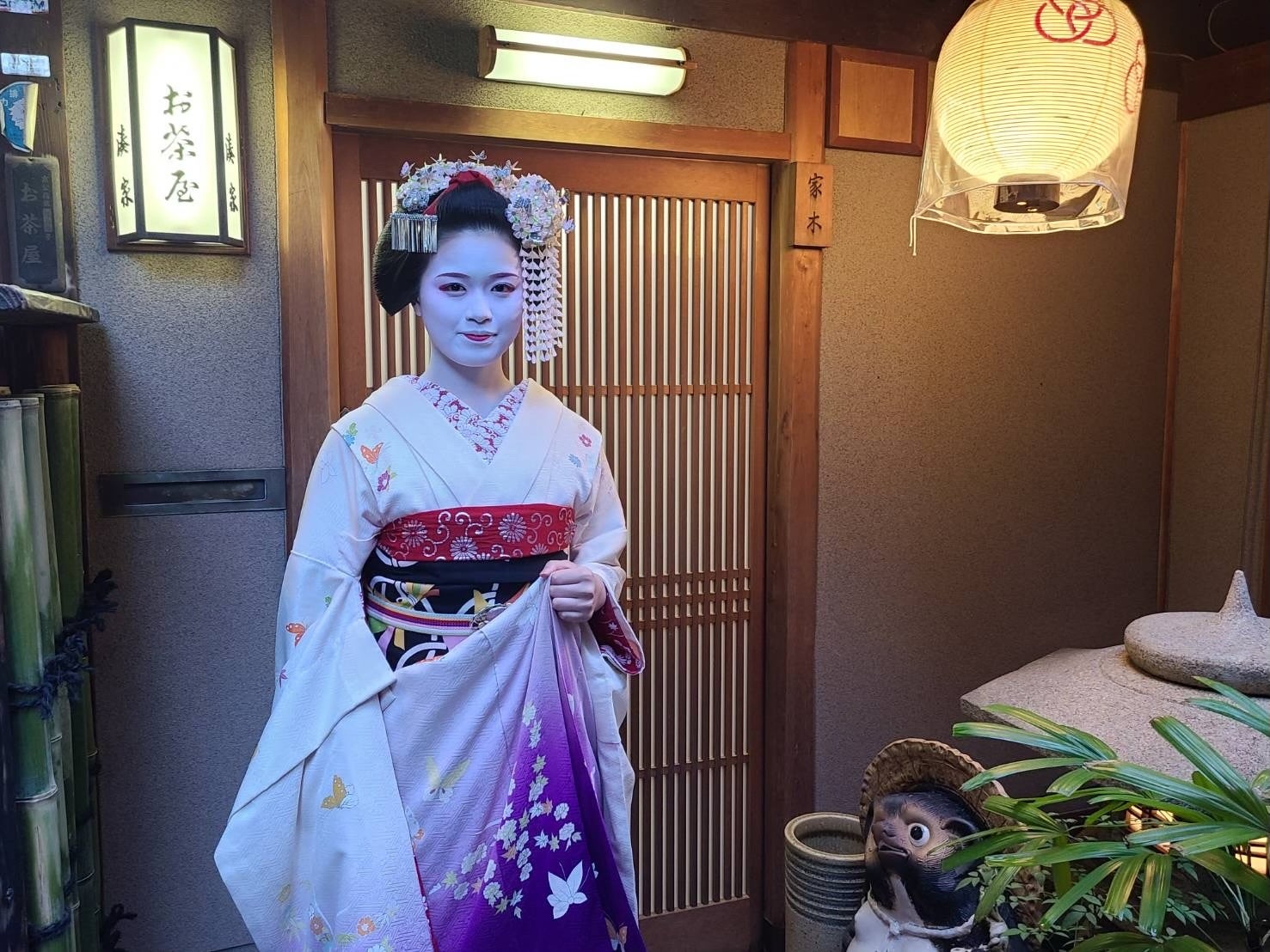 おしろいに真っ赤な口紅、華やかなお着物、所作の美しさなど誰もが目を奪われるその姿、はんなりした京言葉が可愛らしい舞妓さんです。