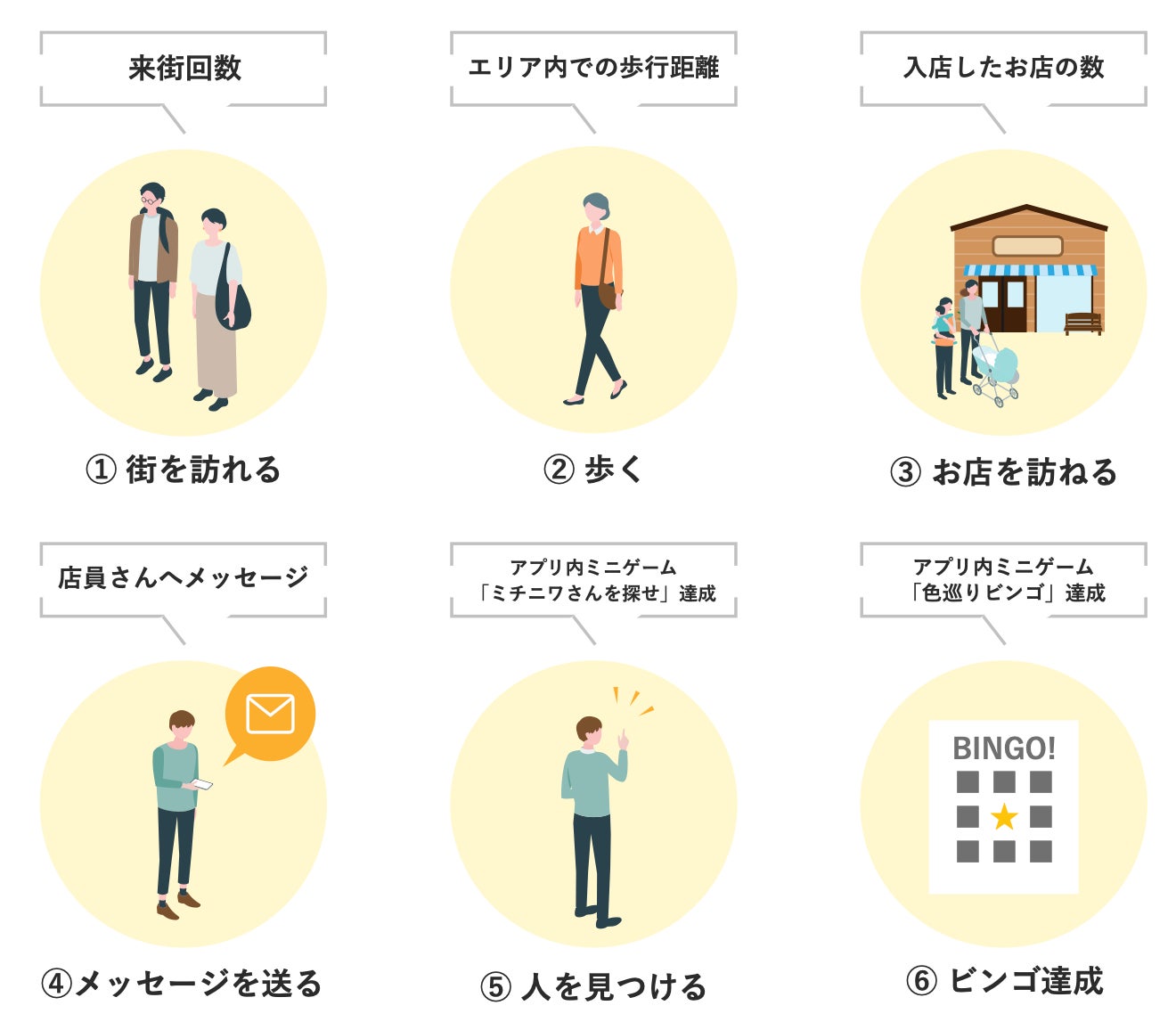 このアプリでは、ミチニワエリアを歩くなどの以下の6種類のアクションでマイレージを獲得することができたり、お得なクーポンを取得できたりします。