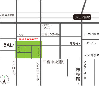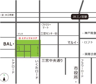 三宮・元町駅のちょうど中間。歩いて5分のこの場所 「ミチニワ」は、センター街の南側にのびる「三宮本通商店街」と「センターサウス」一帯をまるっと示す名称です。 およそ 150年前まで、この界隈は大きな森がありました。 街道に面し、航海の安全や商工業の繁栄を守る三宮神社の 境内だったこの界隈は、泉が湧き緑に包まれた、だれも が思い思いに過ごせる心地いい場所でした。そこに自 然に人々が集まり、賑わいが生まれ、この街は少しずつ 歩み始めたのでした。その場所のあたらしい姿を今こ そ。そしてもっとたくさんの方々に。