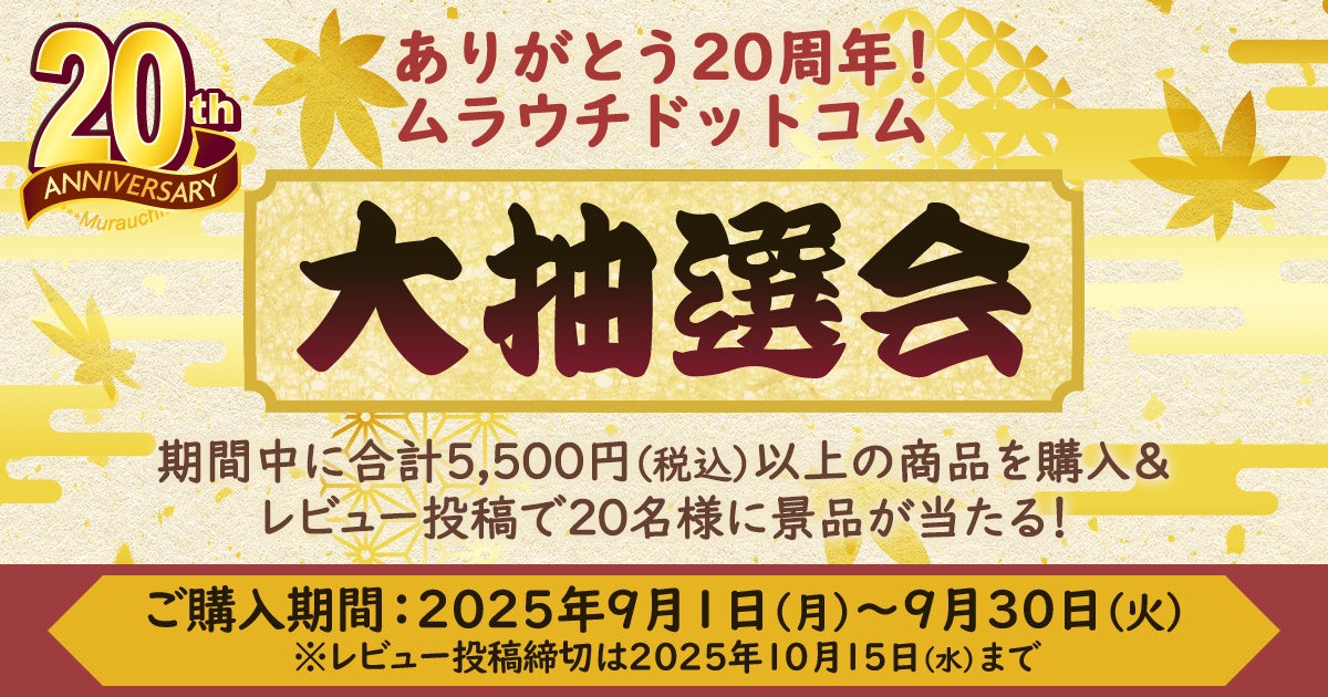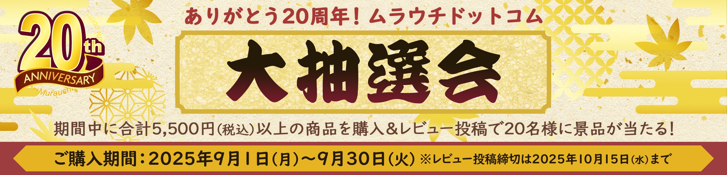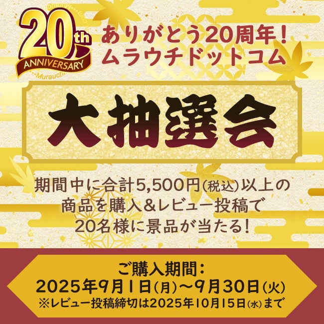 2025年9月1日 (月) ~2025年9月30日 (火) の期間、murauchi.com本店にて合計5,500円 (税込) 以上の商品をご購入いただき、商品レビューを投稿してくださった方の中から 20名様に、景品 (※) が当たる抽選会を開催します。