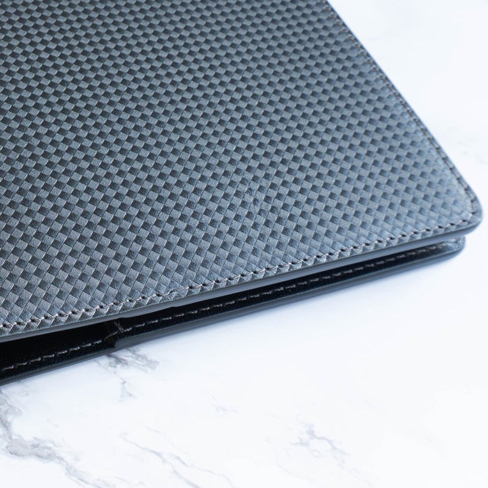 私どもは、そんなカーボンのデザインを本革製品にも取り入れたいと考え、今回こちらのA5サイズのシステム手帳を作製しました。