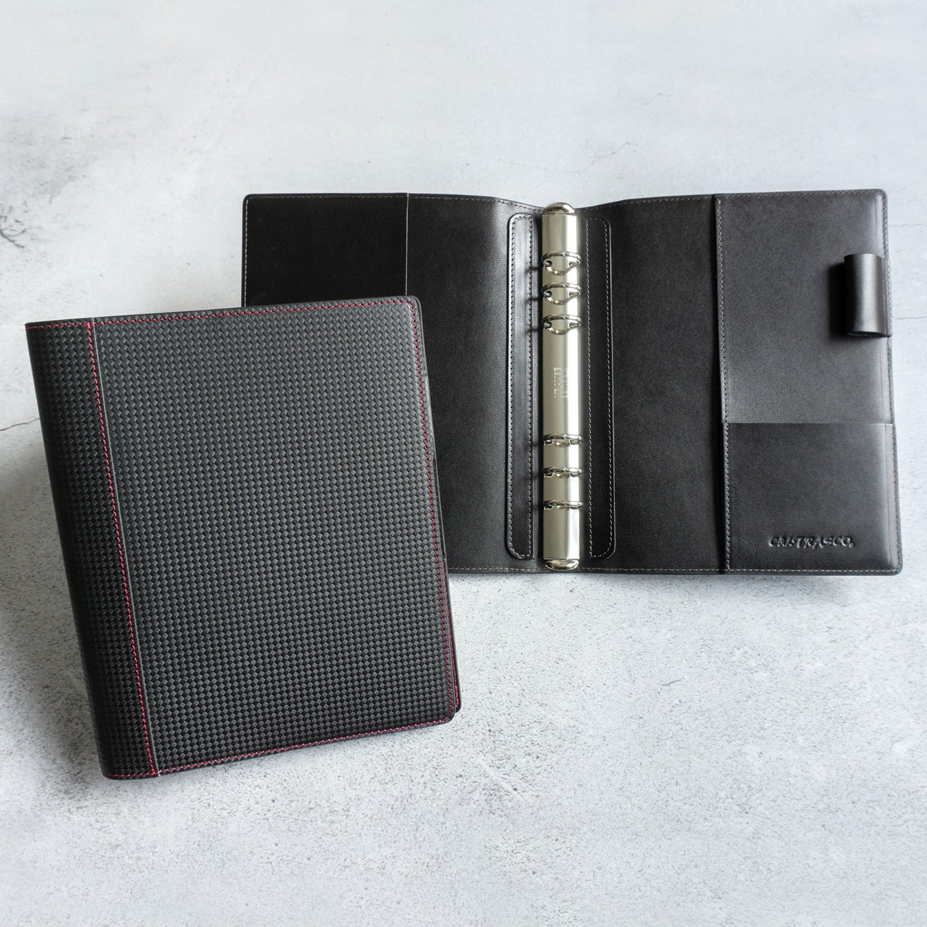 カーボン柄レザーと栃木レザーのシステム手帳バインダー A5サイズ ブラック、ステッチカラー:グレー、レッド