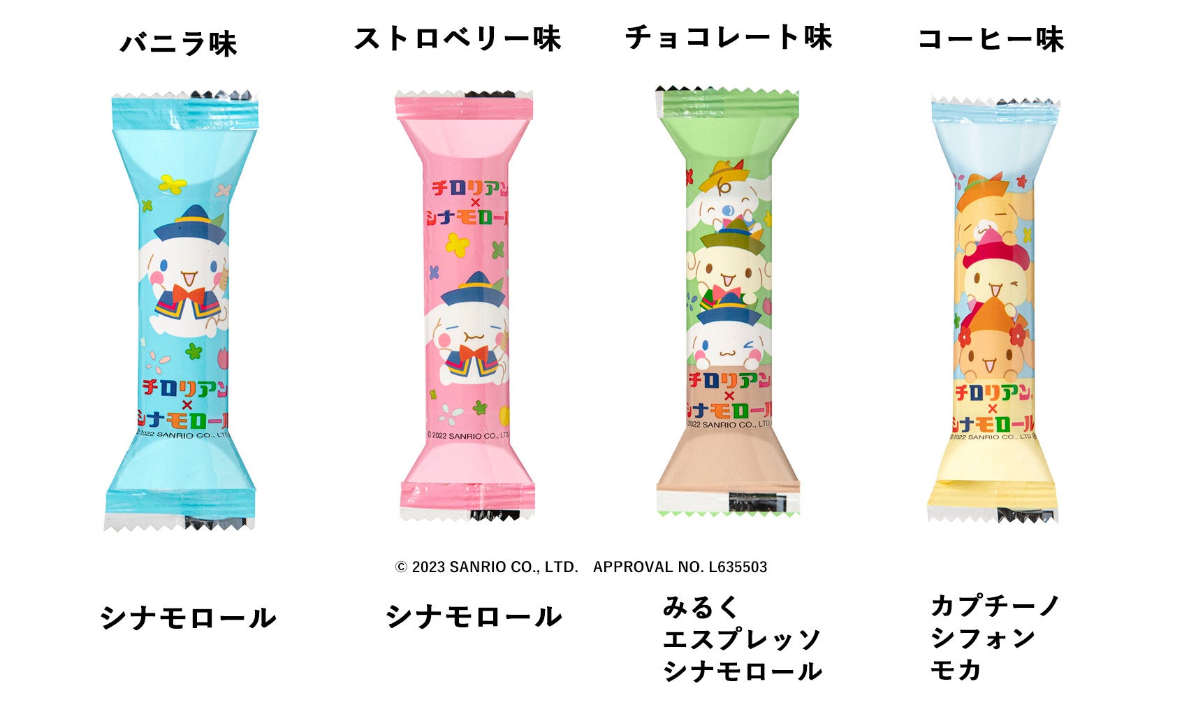 チロリアンを頬張るシナモンロールやフレーバーごとに異なるデザインとなっており、色々な表情のシナモロールとお友だちが楽しめます。この機会に是非、お召し上がりください!
