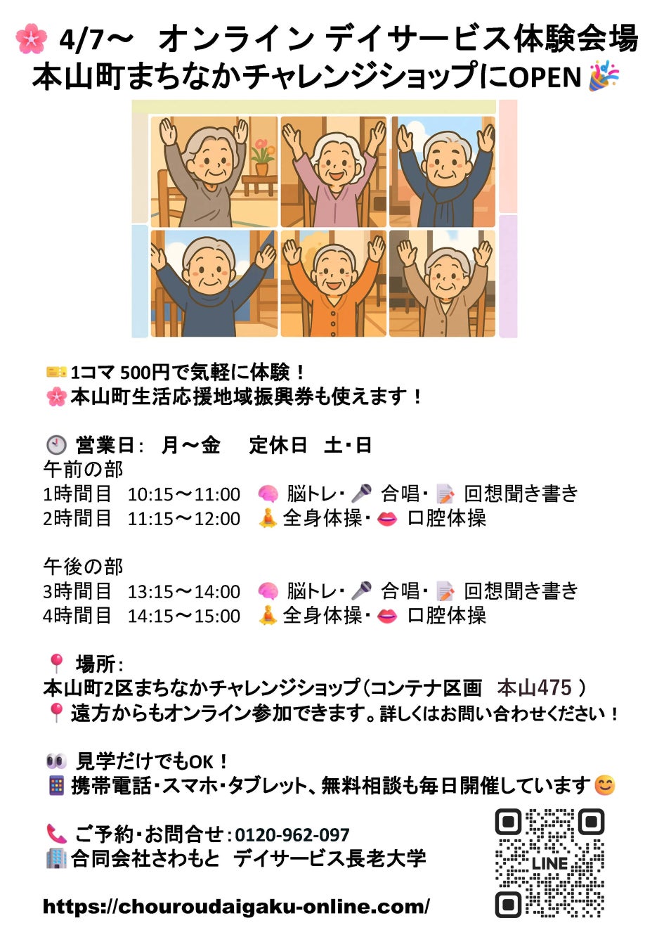 合同会社さわもと(高知県本山町)は2025年4月7日、シニア向きオンラインデイサービスを体験できる「チャレンジショップ」をオープンします。全国どこからでもご参加可能です!