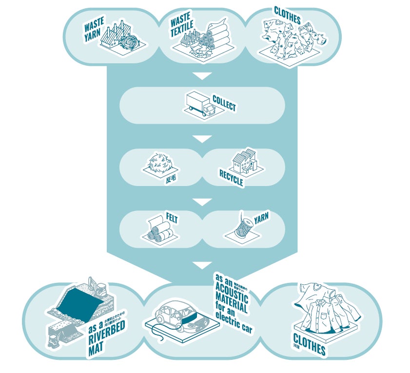 ポリエステル素材をポリエステル糸に再生することで、衣服や資材など様々な用途へ循環させることを可能にし、石油資源の使用量削減を実現します。糸への再生が難しい素材は、反毛後に自動車の吸音材や水害防止用の河川敷マットなどへ再利用し、資源を無駄にせずに有効活用することで、焼却処分される繊維の量を減らし、温室効果ガスの発生削減にも貢献します。