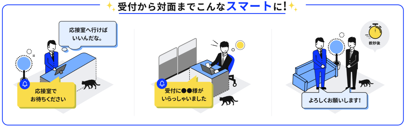 ラクネコは、受付対応の課題を解決し、受付からご対面までをスマートに対応する受付システムです。
