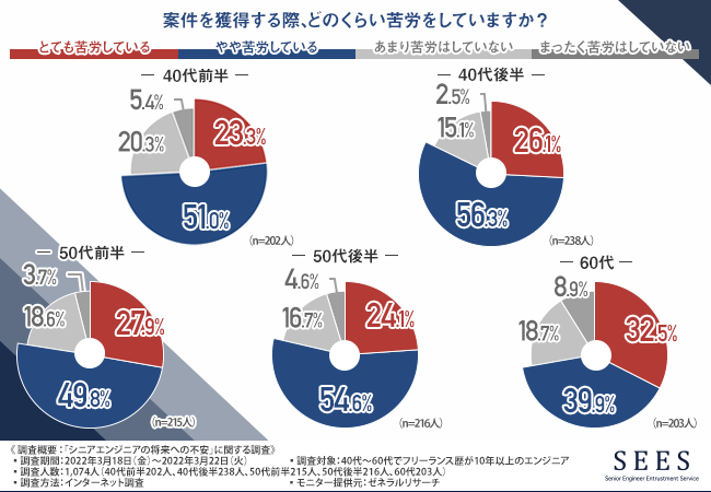 そこで、「案件を獲得する際、どのくらい苦労をしていますか?」と質問したところ、年代別で以下の結果となりました。