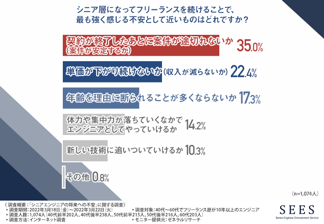 そこで、「シニア層になってフリーランスを続けることで、最も強く感じる不安として近いものはどれですか?」と質問したところ、『契約が終了したあとに案件が途切れないか(案件が安定するか)(35.0%)』と回答した方が最も多く、次いで『単価が下がり続けないか(収入が減らないか)(22.4%)』『年齢を理由に断られることが多くならないか(17.3%)』と続きました。