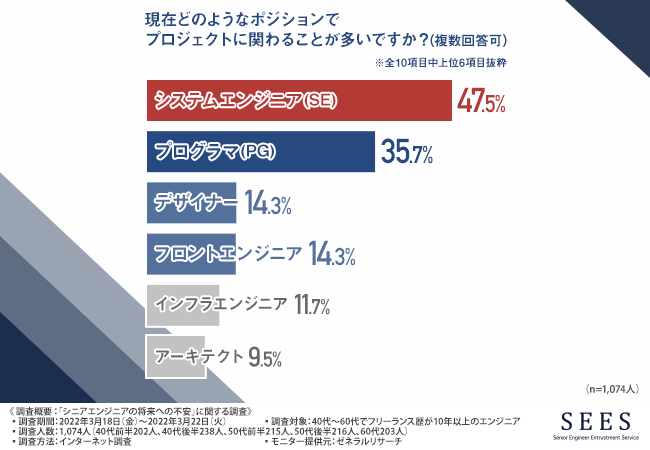「現在どのようなポジションでプロジェクトに関わることが多いですか?(複数回答可)」と質問したところ、『システムエンジニア(SE)(47.5%)』と回答した方が最も多く、次いで『プログラマ(PG)(35.7%)』『デザイナー(14.3%)』『フロントエンジニア(14.3%)』と続きました。