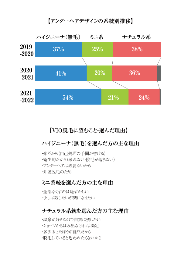 また、来店するお客様の相談として「脱毛したいけど温泉でアンダーヘアが全くないことが恥ずかしい」という声が減少し、「温泉やジムでハイジニーナの方を多く見かけるようになり毛がある方が恥ずかしいと思った」というような、他人のアンダーヘアを見て自分も脱毛しよう!と決断する方が増えていることを実感しています。