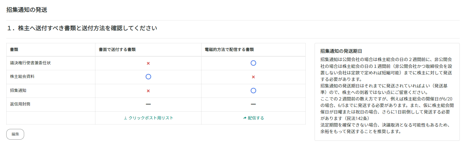 議決権行使の方法や株主総会資料の共有方法の設定に応じて書面で送付すべき書類、電磁的方法で配信する書類を明記しました。