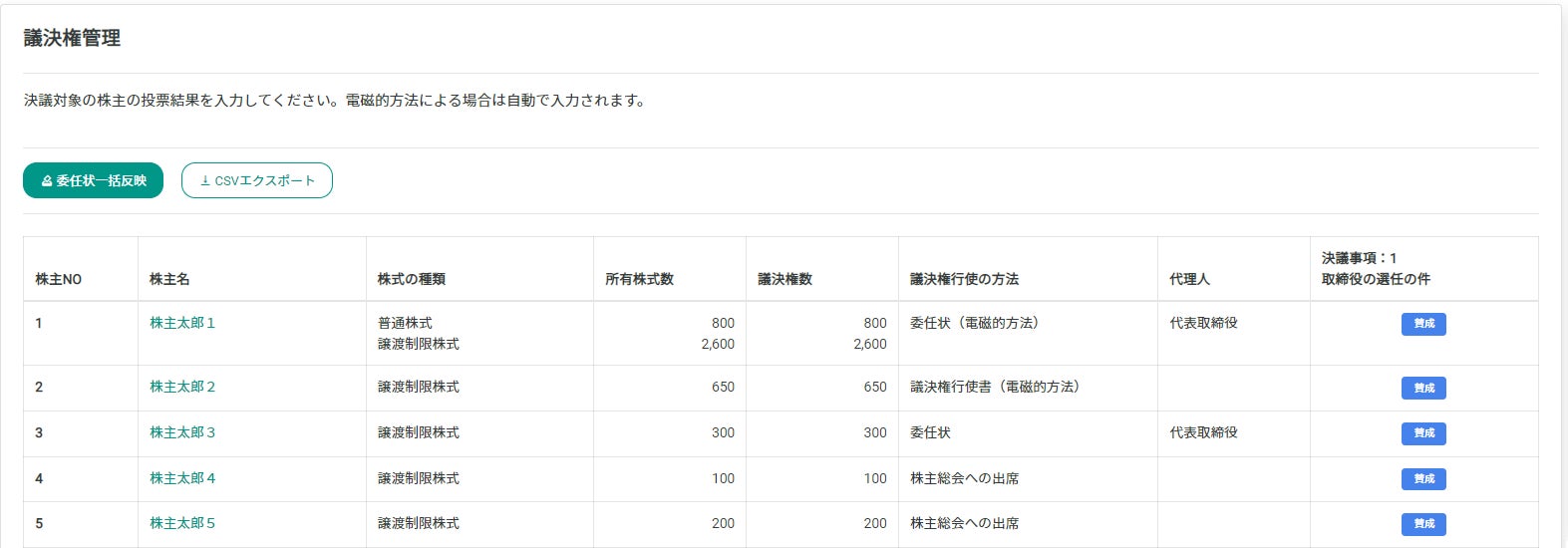 委任状について代表取締役に一任する場合の回答があった場合、一括で決議事項の賛否を反映する機能を搭載しました。