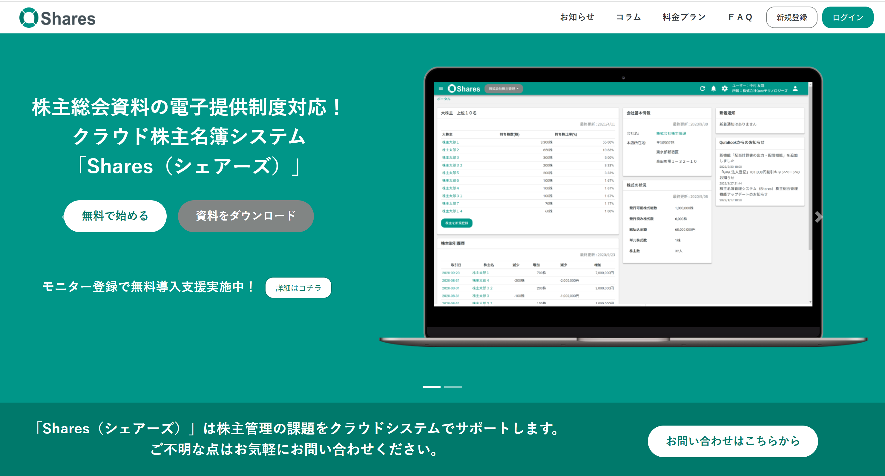 Shares<シェアーズ>はクラウド上で株主名簿を作成し、各種帳票の出力や配当金の計算、株主総会管理をオンラインで実施できるサービスです。この度、株主総会資料の電子提供制度をはじめとする会社法の改正に伴い、株主総会手続の電子化を強化するアップデートを実施しました。