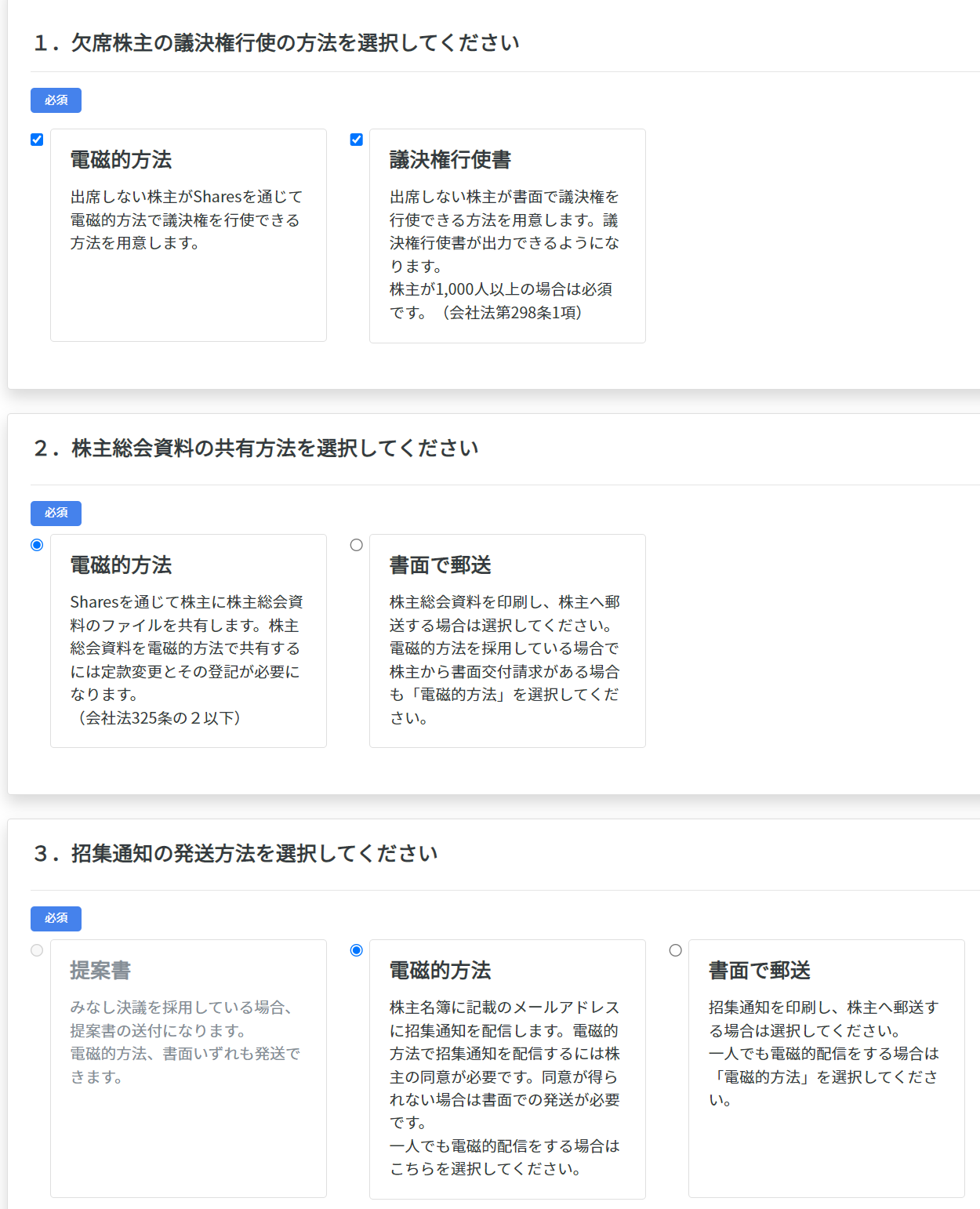 例えば株主総会資料の電子提供制度を利用するためには、定款変更とその登記が必要になりますが、その旨を選択肢に明示することで適法な株主総会運営を支援させて頂いています。