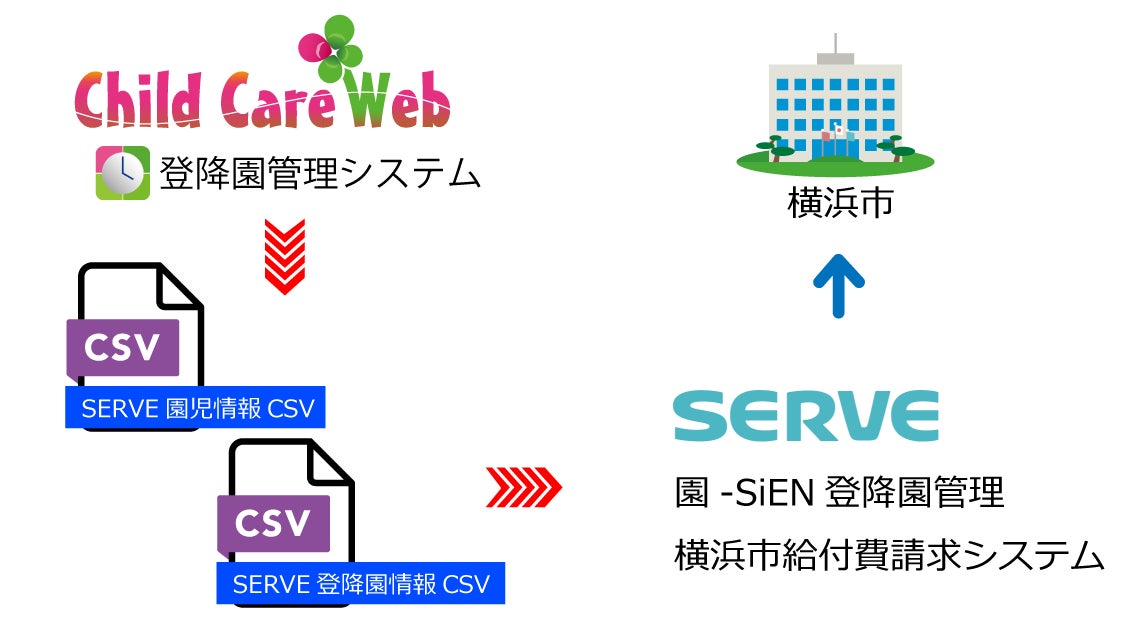 そこで今回、ChildCareWebの登降園管理システムの情報をSERVEシステムを介してそのまま横浜市の給付費請求のデータとして活かすことができる仕組みとすることで、導入システムのマッチングの選択肢を広げる効果があると期待しています。