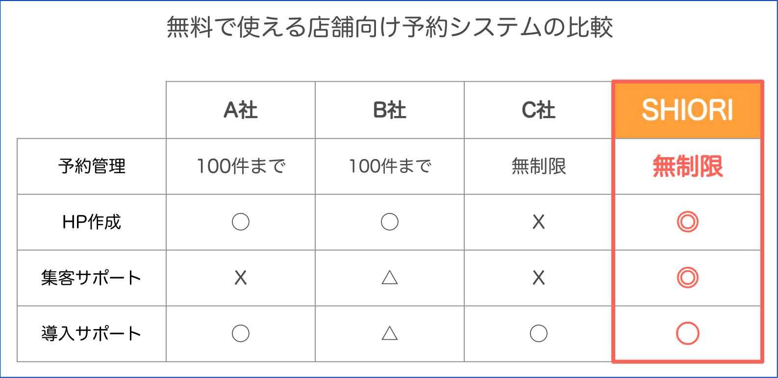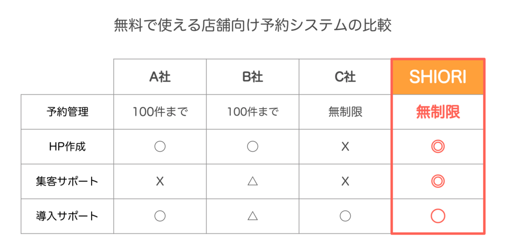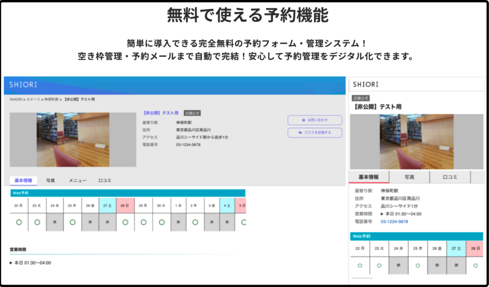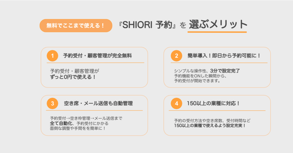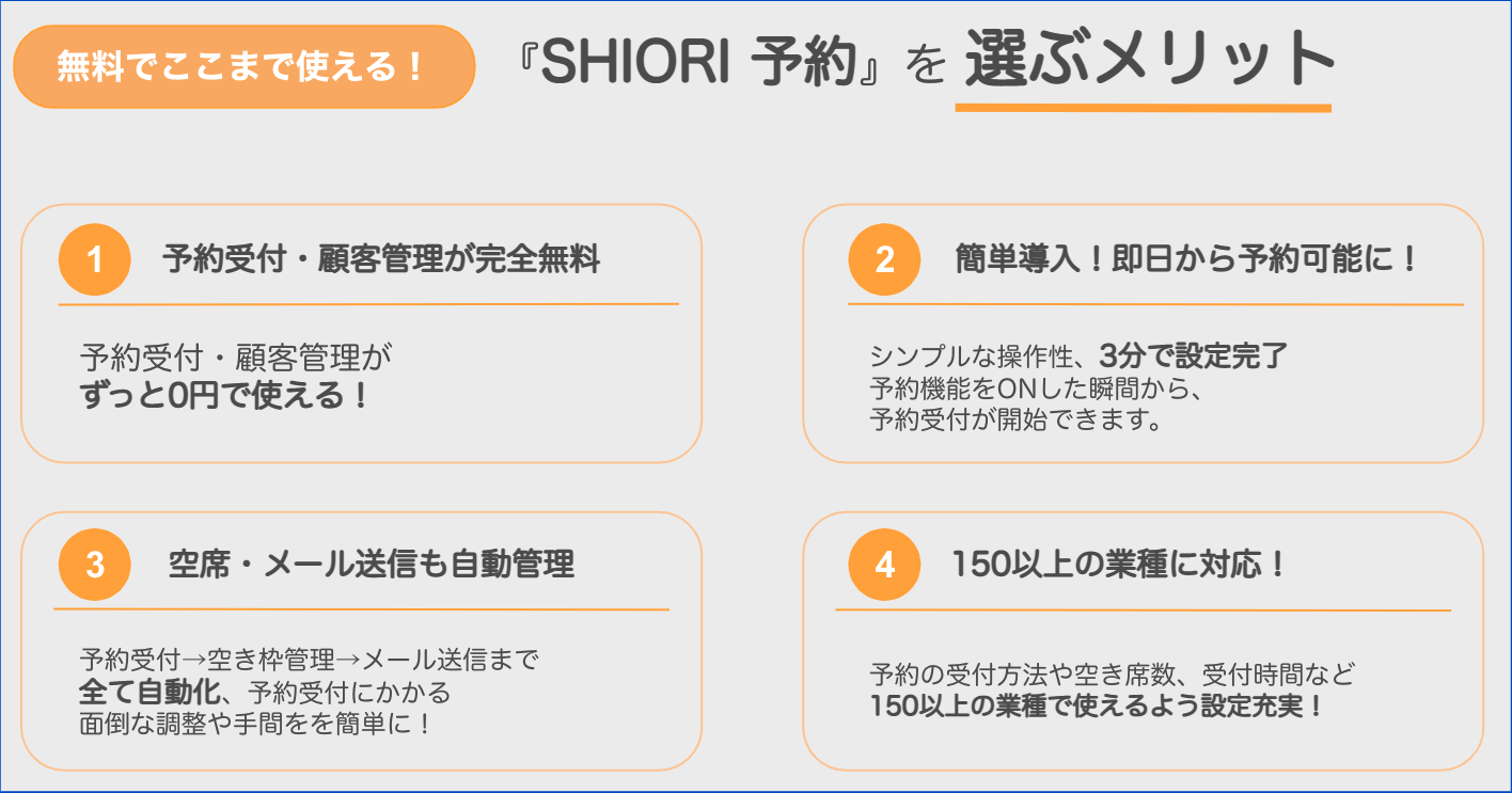 こういったお客様の悩みを解決するため、SHIORIでは「無料プラン」の提供に踏み切りました。予約機能の導入コストを無くし、お店の売上につながる集客をご支援いたします。ぜひこの機会にご活用ください。