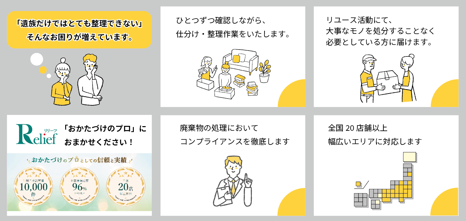 リリーフはグッドホールディングスグループ(https://www.goodhd.co.jp/)の「おかたづけサービスの提供」と「不用品のリユース事業」を行う「おかたづけのプロ集団」です。創業60年の実績と信頼に裏付けされたサービスを提供し、東名阪を主な地盤として、全国で20店舗以上を展開しており、年間10,000件のご相談実績を誇ります。遺品整理・相続・不動産売却等に伴う不用品処分や残置物撤去を中心に、ハウスクリーニングやお仏壇の処理等も含め、ライフステージの変化に伴うお悩み解決をワンストップで対応しています。