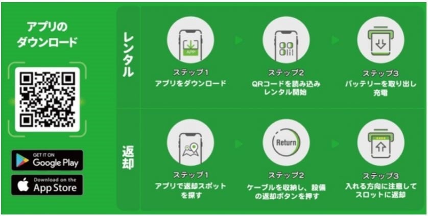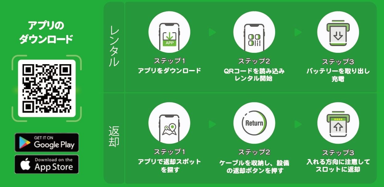 (4)アプリで最寄りのバッテリースタンドを検索し、空いているスロットにモバイルバッテリーを差し込むことで返却は完了です。