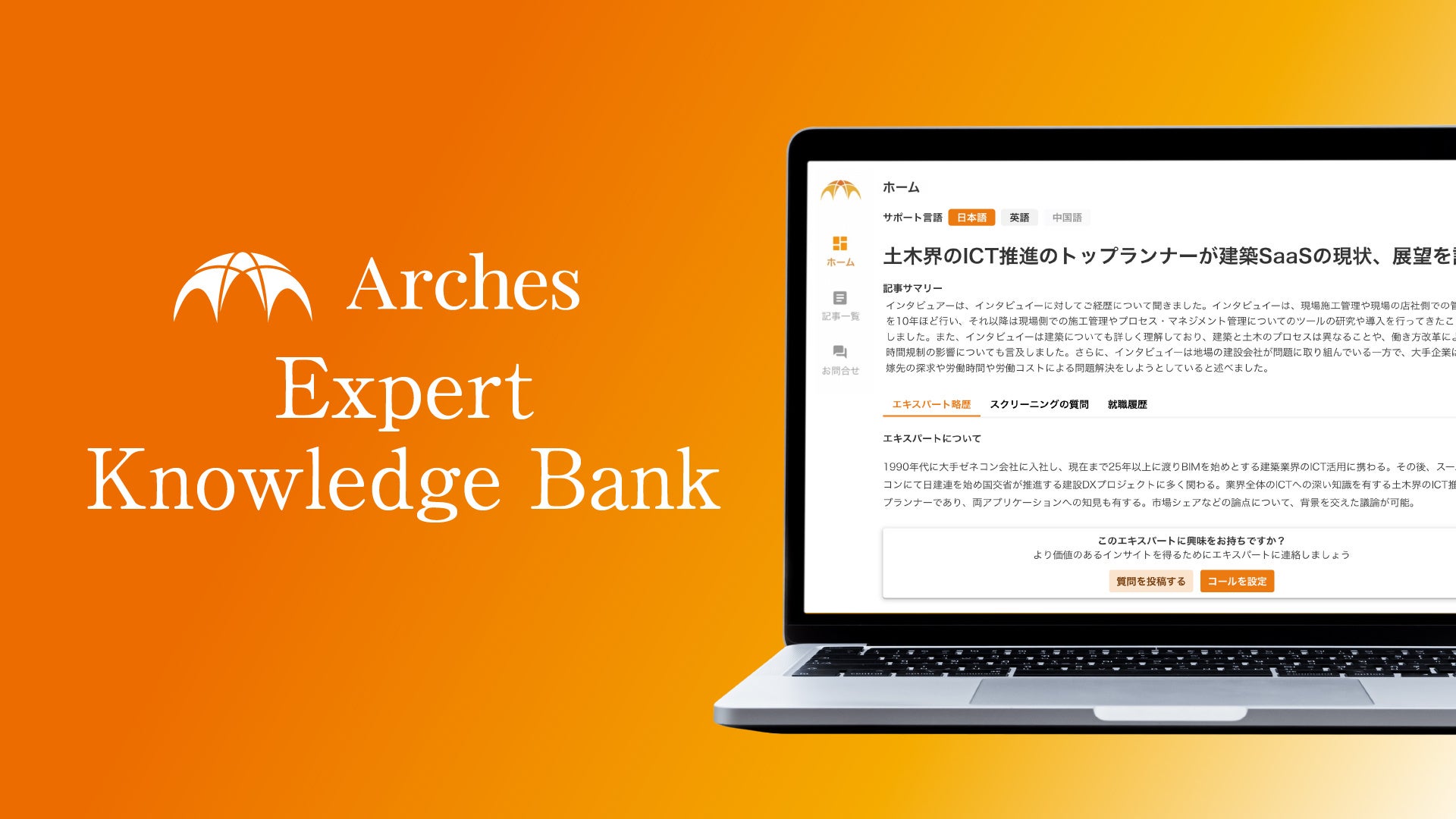 Archesがマッチングした世界中のエキスパートのインタビューを蓄積していくことで、より多くのお客様にいつでも気軽に安価に専門知見を検索・閲覧いただきたいと考えております。2023年にベータ版をローンチし、上場株投資を行う運用会社様を中心にご利用を開始いただいており、今後は、インタビュー記事を中心としたコンテンツの増加、ChatGPT等を活用した記事のサマリやトレンド分析といった機能の拡充を進めてまいります。