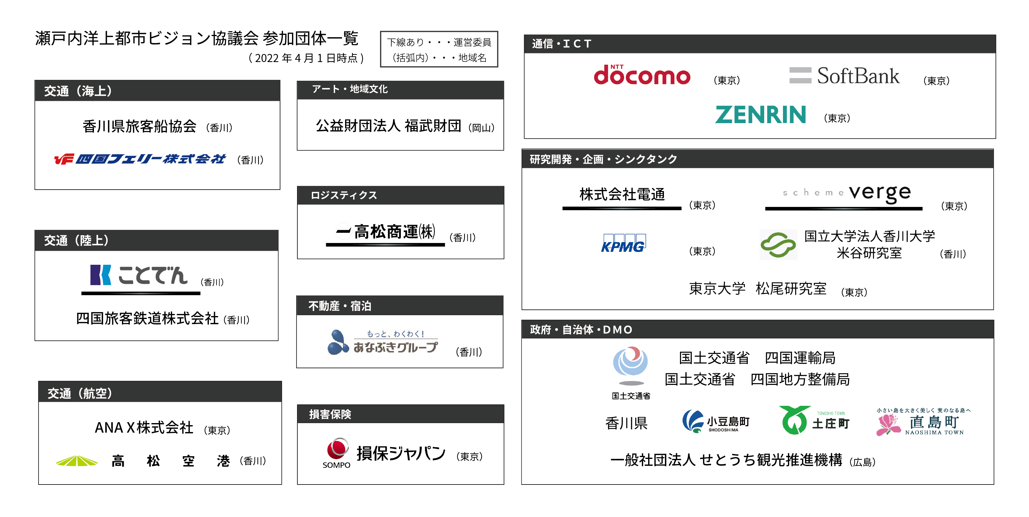 scheme verge株式会社/高松商運株式会社/株式会社電通/ことでんグループ/穴吹興産株式会社/株式会社ゼンリン/ANA X株式会社/一般社団法人せとうち観光推進機構/四国旅客鉄道株式会社/高松空港株式会社/香川県旅客船協会/四国フェリー株式会社/ソフトバンク株式会社/損害保険ジャパン株式会社/KPMGモビリティ研究所/株式会社NTTドコモ 四国支社/香川大学米谷研究室/東京大学松尾研究室/公益財団法人 福武財団/国土交通省 四国運輸局/国土交通省 四国地方整備局/香川県/土庄町/小豆島町/直島町