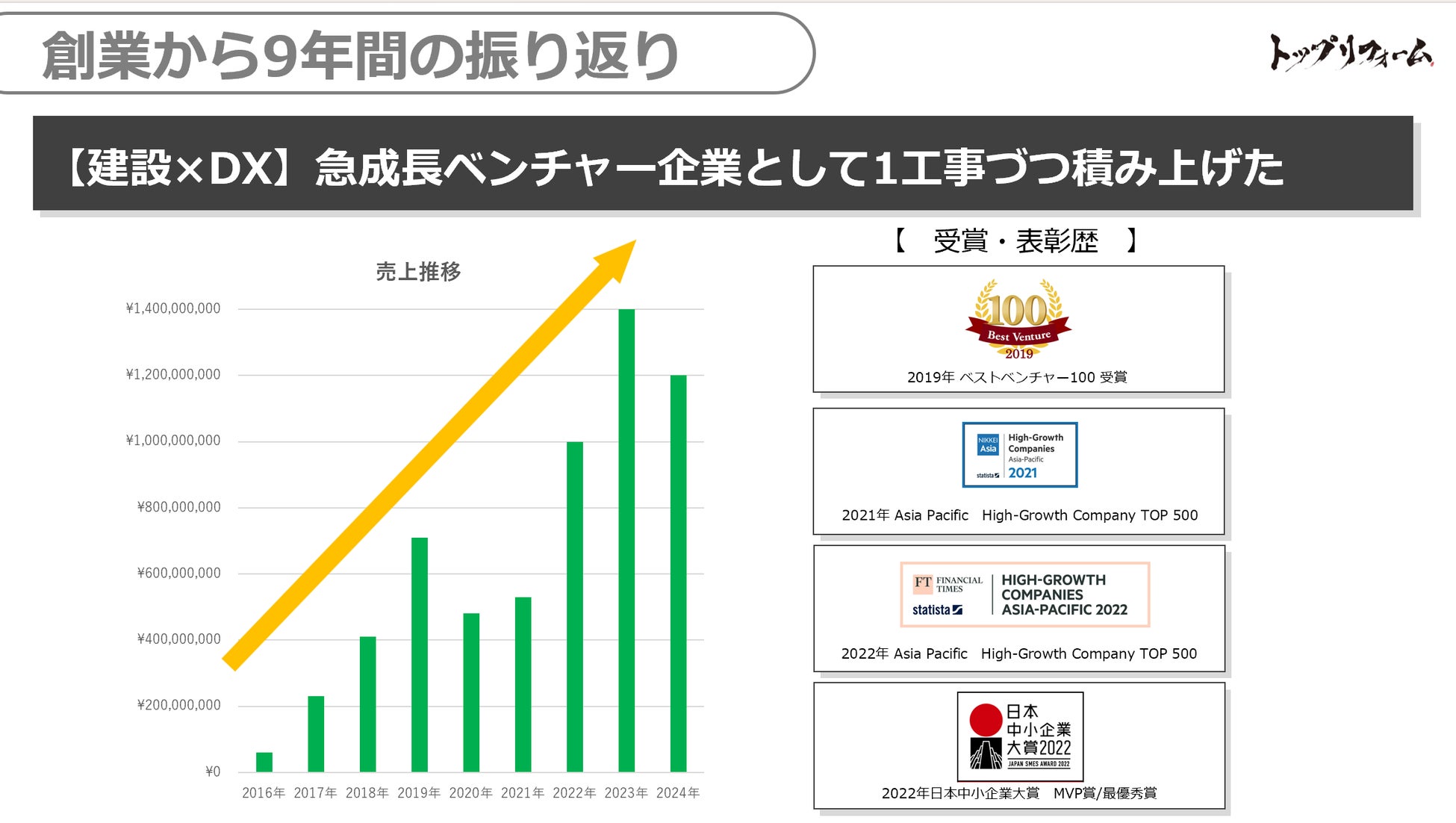 株式会社トップリフォーム(代表取締役社長 永井良、東京都)は、2024年9月20日(金)、全国の職人を一堂に集めた「Partner Convention 2024」を五反田文化センターにて開催します。本イベントは、創業から10期目を迎える同社が、これまでの歩みを共有し、今後のビジョンや中期経営計画を発表し、パートナーである職人を表彰する場として企画されました。