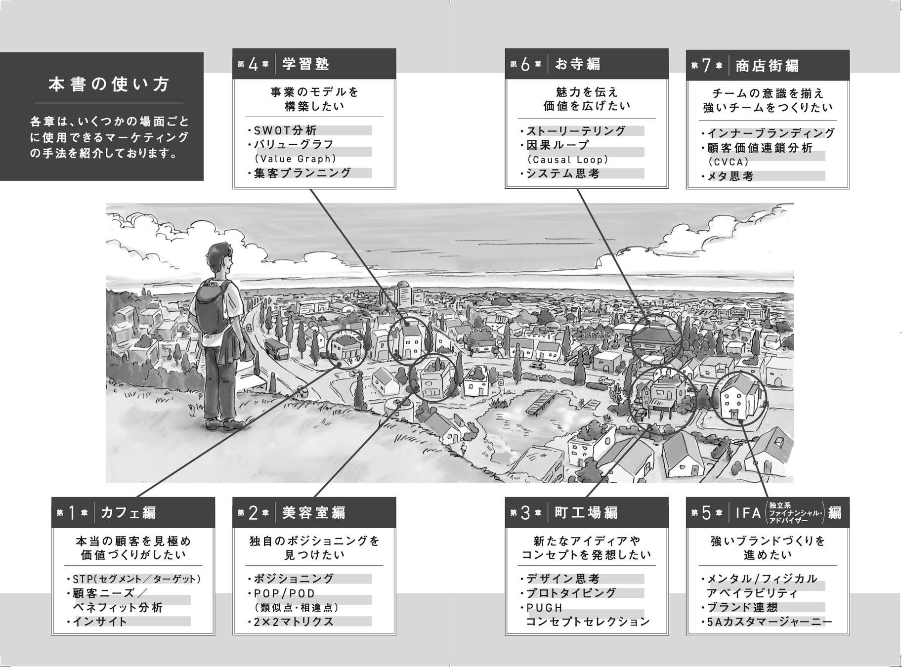 マーケティングや経営、ビジネス書にあまりなじみがない読者でも、楽しみながら読み進められるように、豊富な実例やケースストーリーによって、 わかりやすく楽しく学んでいけるよう1つの物語として構成されています。