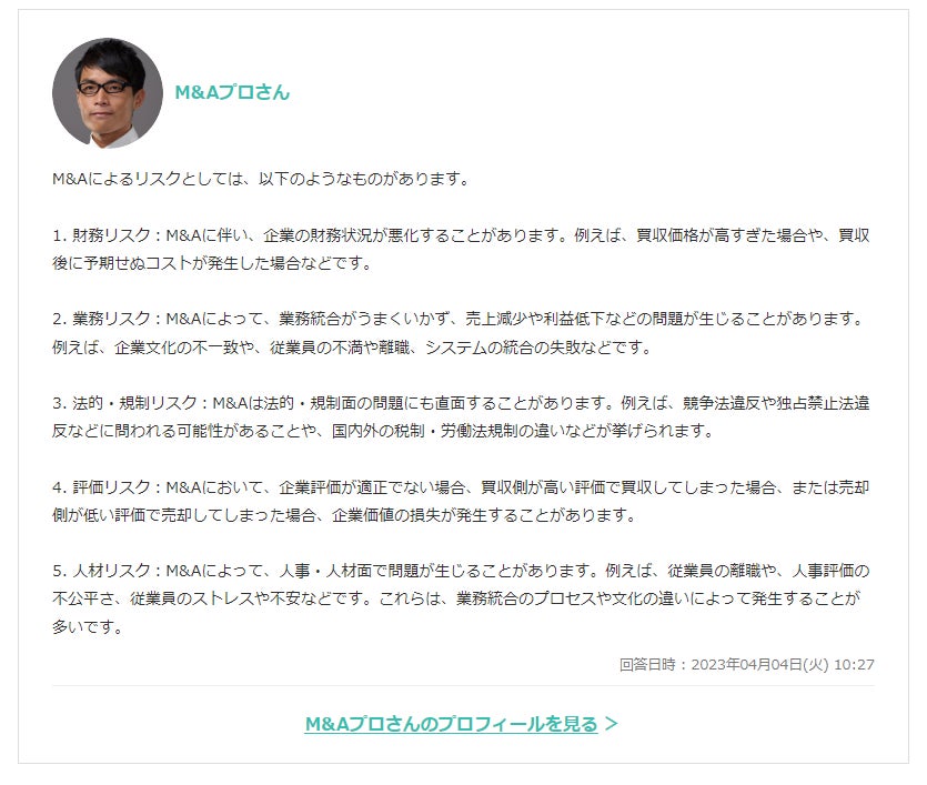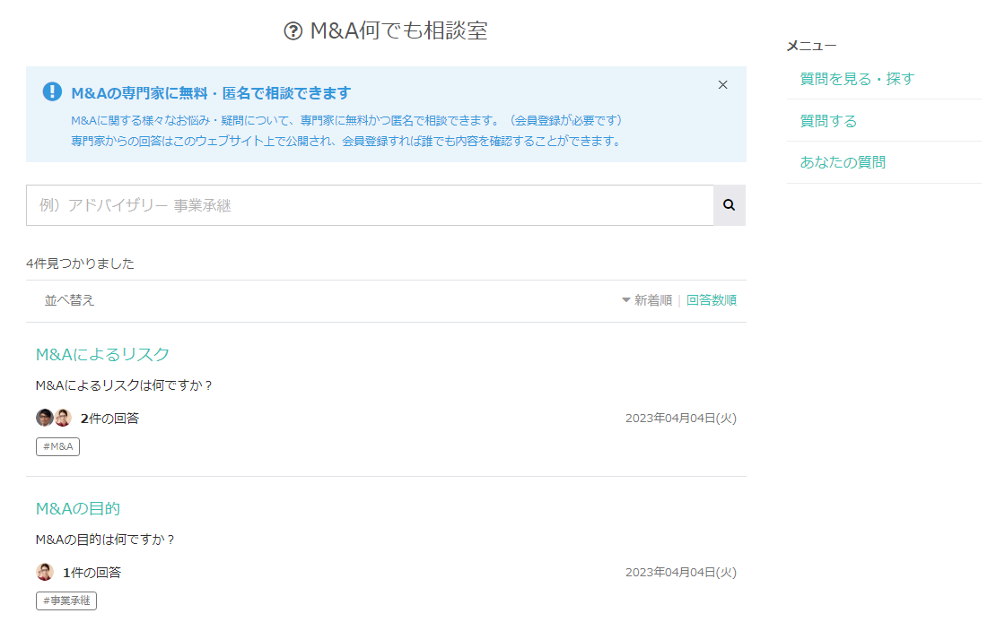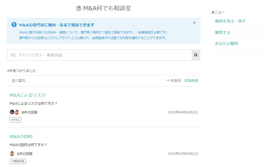 株式会社M&Aスタジオ様が運営するM&A相談ドットコム(https://ma-soudan.com/)では本機能を採用し、既に提供を開始しています。同サイトには、多くの経験豊富なM&A専門家が登録されており、ユーザーはビデオ通話や公開Q&Aを利用して、気軽にM&Aに関する相談ができます。