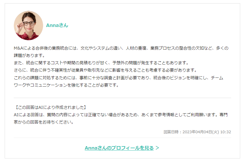 公開Q&AにはChatGPT APIを利用した即時回答機能が搭載されており、ユーザーが質問・相談を投稿するとAIが速やかに回答を提供します。ユーザーは専門家からの回答を待つ間に、AIからの回答を参考情報として活用できます。専門家が投稿したQ&Aの内容をもとに学習を行い、AIによる回答の品質向上を目指す機能も搭載予定です。