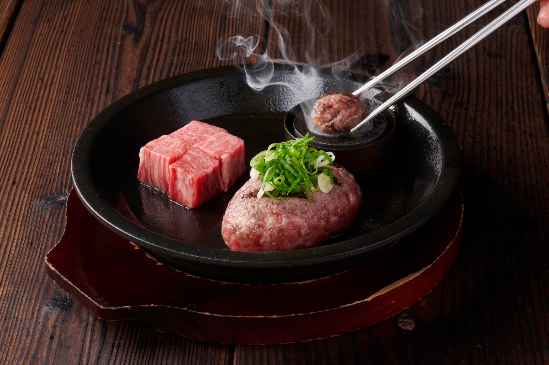 「極味や」ではご注文頂いてからその場でハンバーグを叩き成形しお客様の目の前で表面のみ焼き色を付け、中は生の状態でお客様に提供。それをお客様ご自身で鉄板皿の上に乗ったペレットと呼ばれる焼き石で焼いて頂いてからお召し上がりいただく焼肉スタイルとなっております。