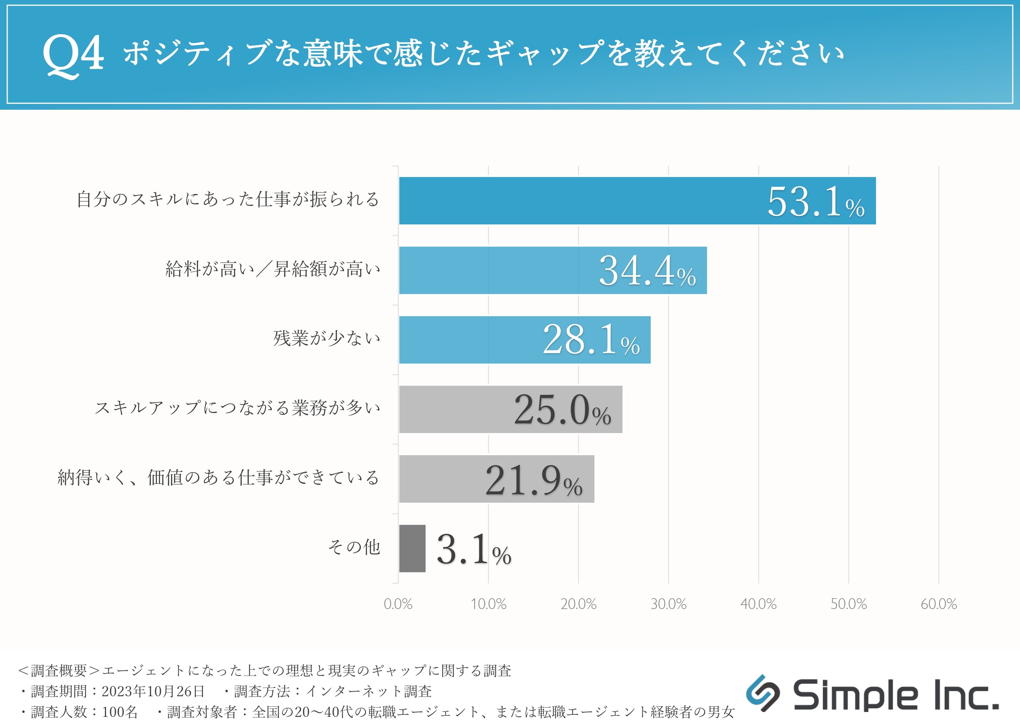 ポジティブな意味で感じたギャップについて伺ったところ、「自分のスキルにあった仕事が振られる(53.1%)」と回答した方が半数以上で最多となりました。