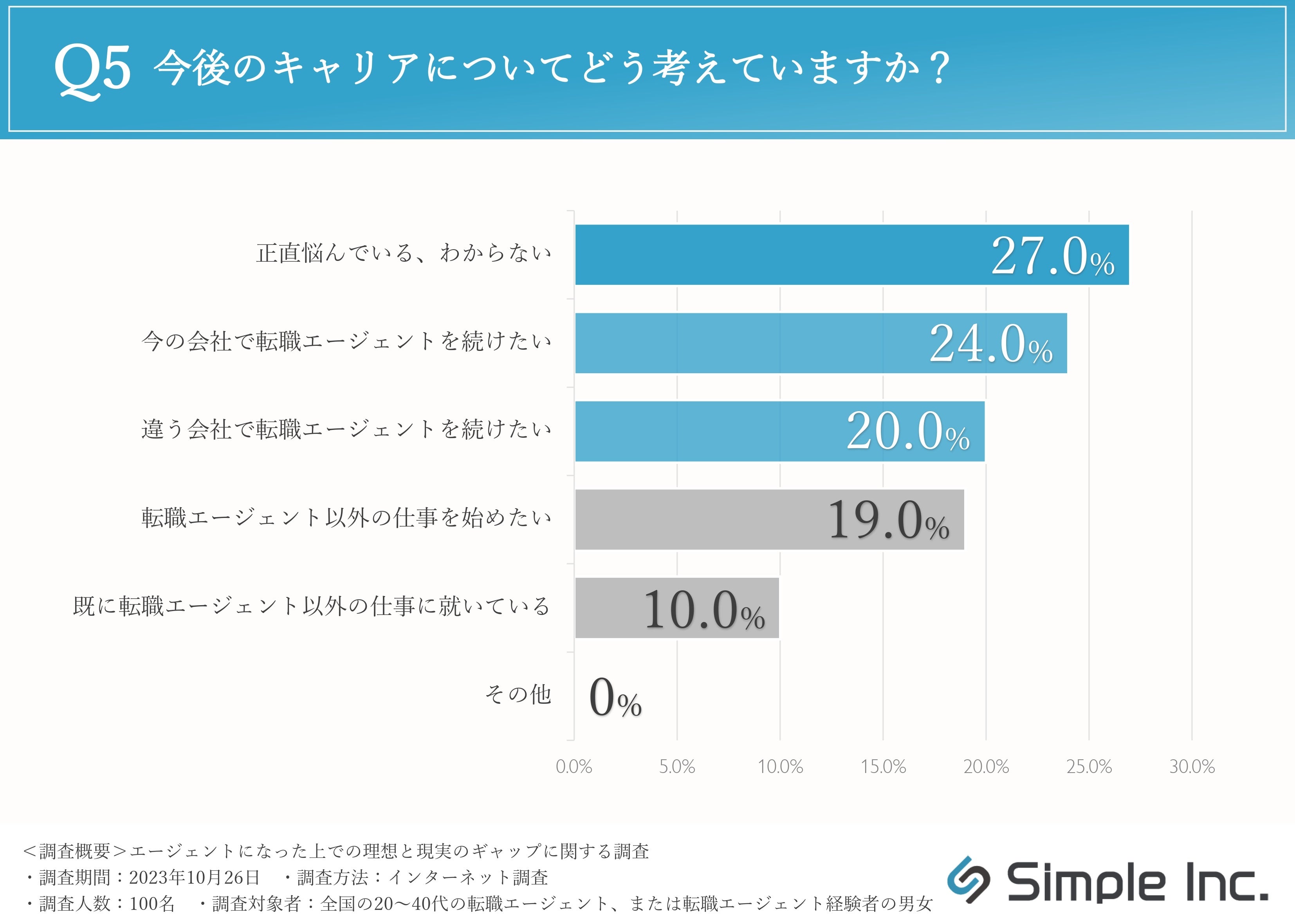 そこで、今後のキャリアについてどう考えているのか伺ったところ、「正直悩んでいる、わからない(27.0%)」が最も多い結果となりました。